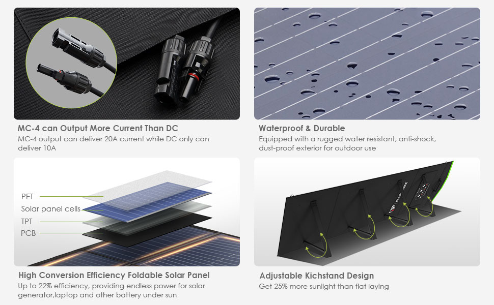 ▶High Efficiency: 140W solar cell is made from US, up to 22% efficiency, providing endless joice for laptop, power station,cellphone and other battery under sun